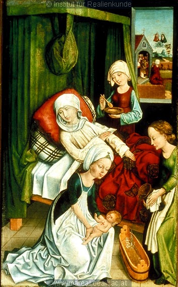 Hjälpkvinna i förkläde. The Birth of St. Roche, Tyskland ca 1475-1485.