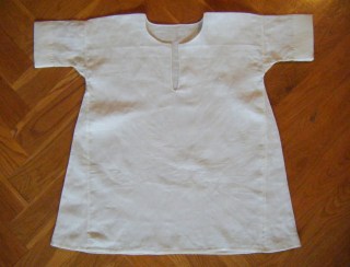 Liten linnesärk, med breda fållar på ärmarna som kan läggas ner när barnet växer.