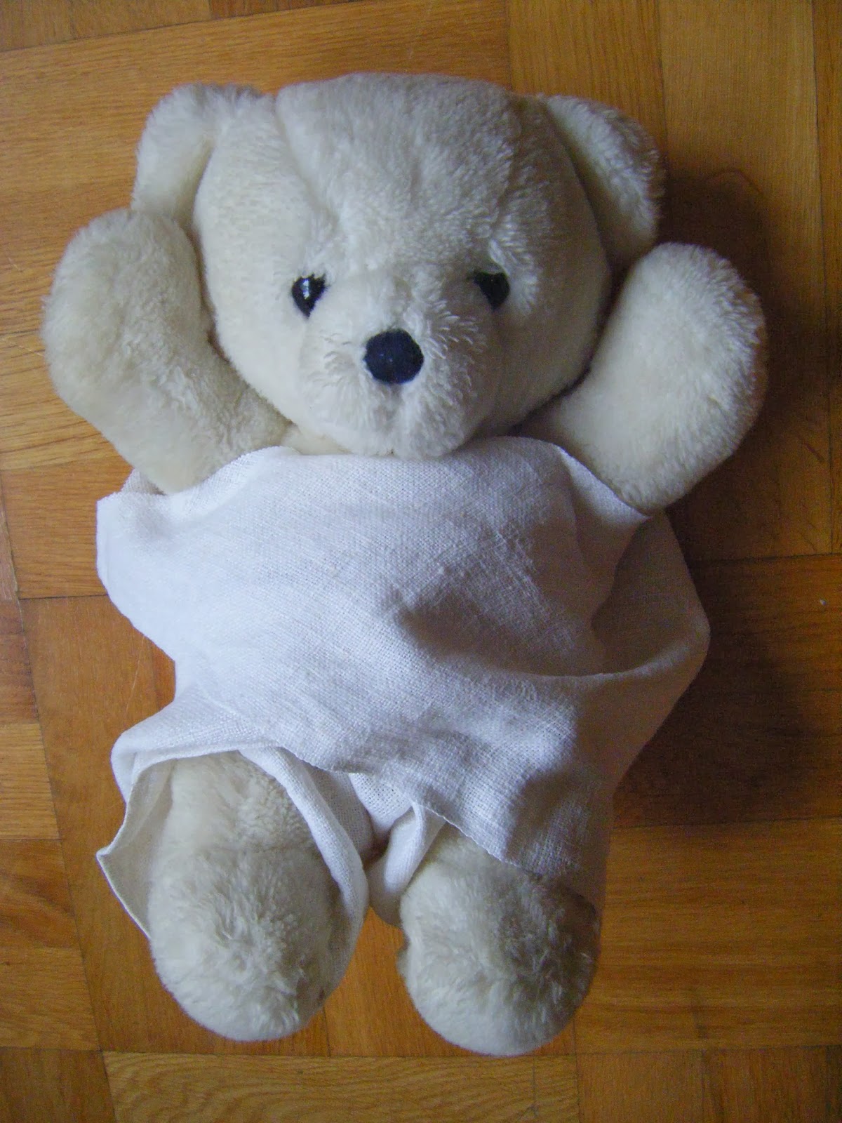 Färdiga blöjbyxor på en alldeles för liten nalle.