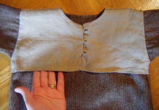 Sprundet i kolten kan hållas ihop med ett litet spänne eller, om du håller på med senare medeltid, med knappar. Liksom på särken så går det att sy några stora stygn över varandra.