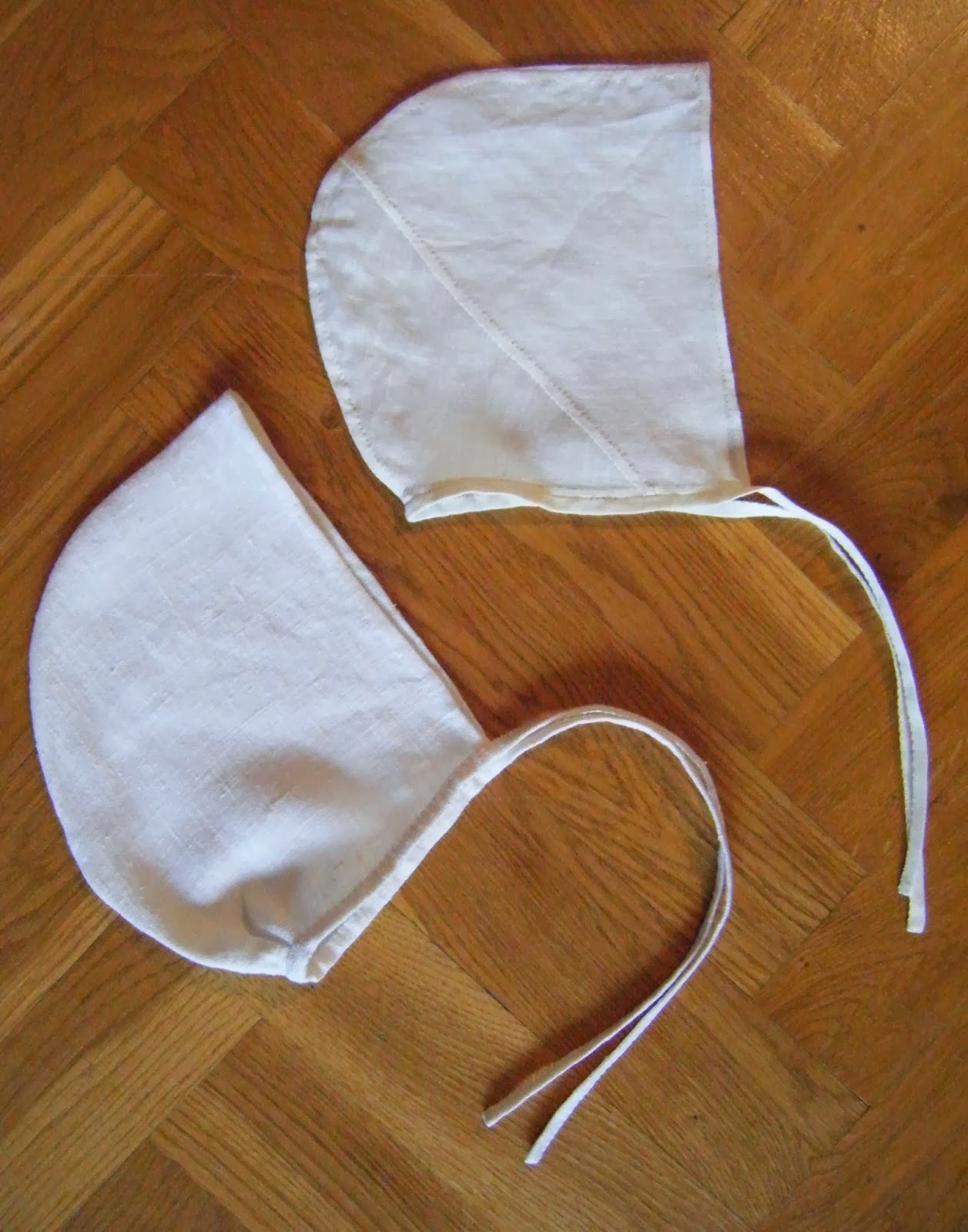 Två små linnemössor, den ena skarvad.