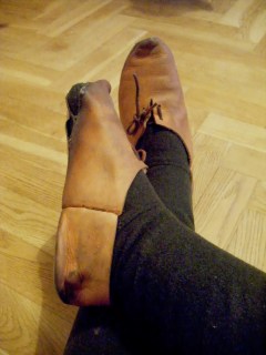 Hosor med avslitna fötter, hål eller lappar både vid knän och armbågar – men knappar framtill helt i tidens anda.