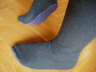 Hosor med nya sulor påsydda efter att de gamla slitits ut.