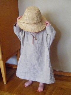 Barnskjorta sydd av en gammal linnelöpare och medeltidig halmhatt
