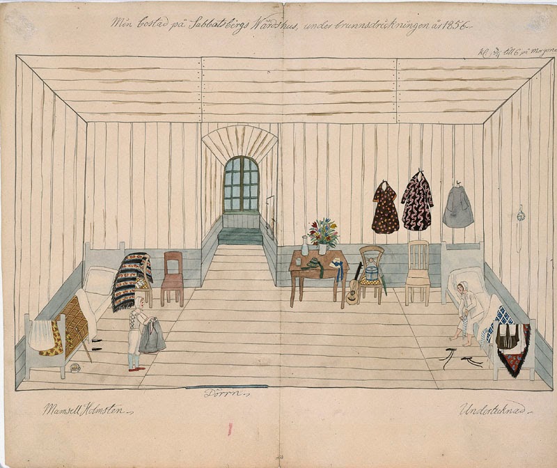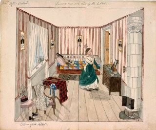 en vit hänger över sänggaveln. Målning av Josabeth Sjöberg, 1856.