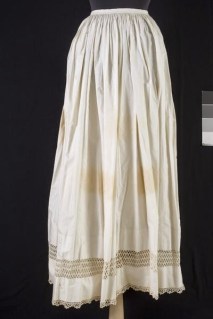 Den nedre delen av denna hemvävda underkjol i bomullskypert har inslag av grövre trådar, ca 1850.