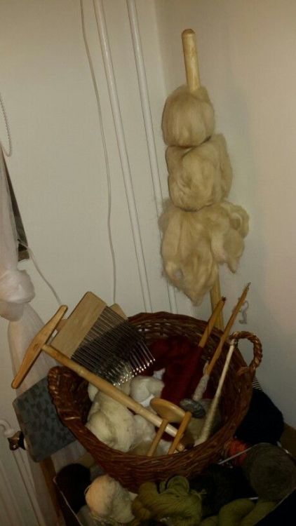 Min ullhörna. Sländor, garn, ull att spinna, ullkammar, ullstav och ett härvträ. Allt för processen från ull till garn!