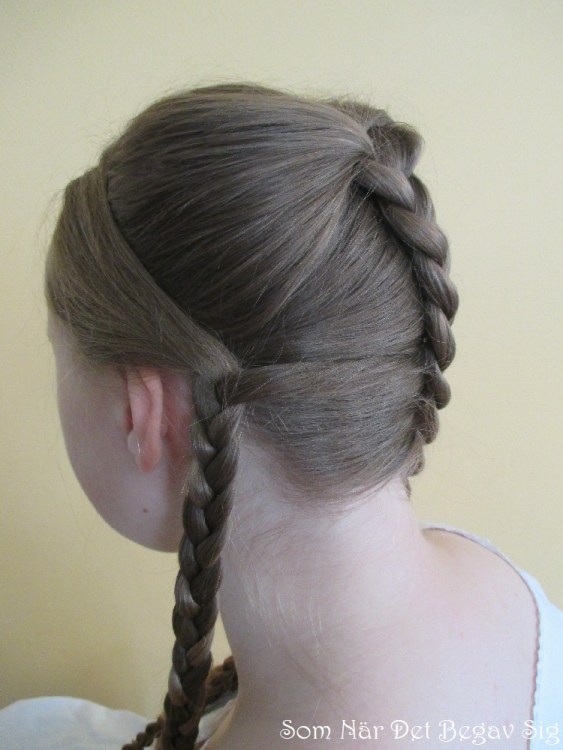 Fläta ihop nackhåret med det främre håret, strax bakom örat. Upprepa på andra sidan. Du kommer nu att ha tre flätor: en på hjässan och en vid var öra, utan att du har någon synlig bena i nacken. Att dra det bakre håret diagonalt på det här sättet var tillsammans med olika vridningar och flätor en metod för att hålla det bakre håret prydligt och elegant när det drogs uppåt i de högt placerade frisyrerna som ses på tidens modeplanscher.