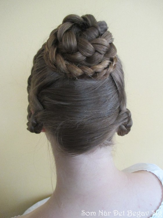 Vrid ihop flätan på hjässan till en högt placerad knut, fäst med hårnålar allteftersom.
