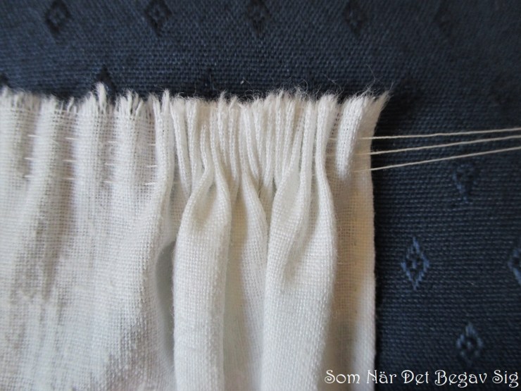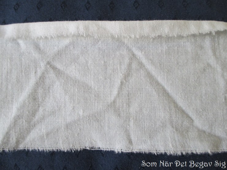 This swatch of white cotton will be stitched as if it was the top portion of a petticoat, but stroked gathers on other types of clothing are made the same way. Adjust choice of thread and length of stitches to your fabric – the finer the fabric, the smaller your stitches will have to be. If your thread is too thin, it might break when you gather your material, so rather choose thread a bit too thick than too thin, especially when gathering long stretches.