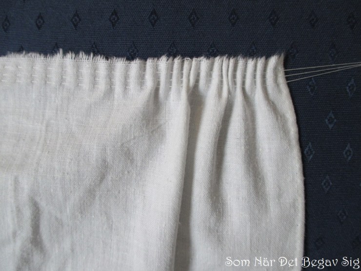 Cartridge pleats are made in a rather similar way, but it’s not quite the same technique, and the two methods were not always used for the same things, even if there is sometimes a bit of confusion surrounding them in fashion history literature. Simplified, you could say that stroked gathers are made in single layer fabric, the raw edge is hidden inside seams, and is therefore good to use to gather large widths of fabric in garments that will need frequent laundry, like underwear, children’s clothing etc. Cartridge pleats are made over a folded edge, with the raw edge exposed, and is good to use when you want to gather huge amounts of width but laundry won’t be an issue, and where you want to avoid all bulkiness in the seam, like women’s dresses and outerwear.