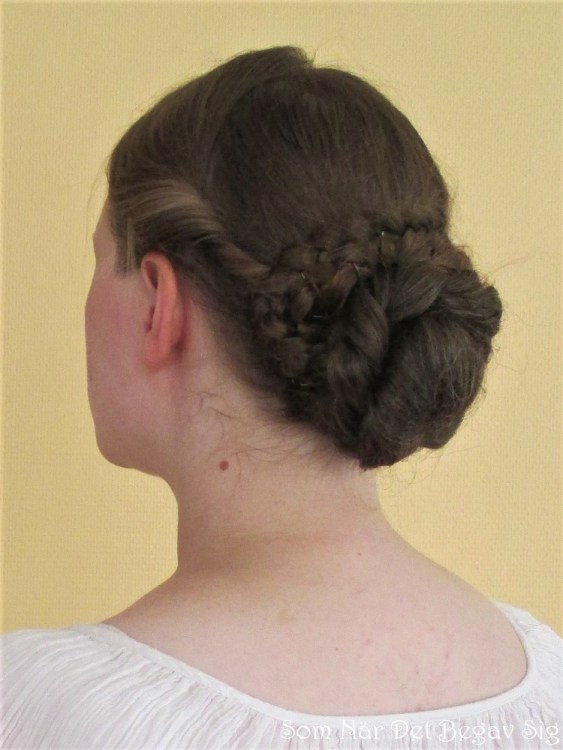 Har du tjockare hår eller använder valkar i de tvinnade slingorna på sidorna så ger det ett mjukare intryck och är också historiskt riktigt. Du kan givetvis också göra den här frisyren utan de dekorativa flätorna, eller inkorporera dem på ett annat sätt. Titta på bilder från tiden och experimentera tills du hittar din egen tidiga 1860-talsstil – det finns många att välja mellan. Det viktigaste är att det främre håret är mittbenat och att knuten sitter långt ner i nacken.