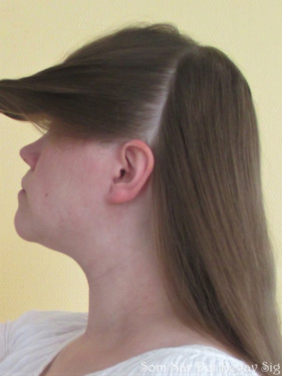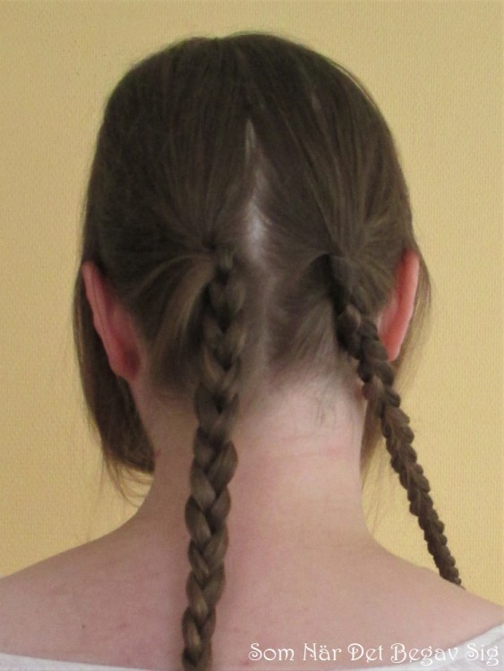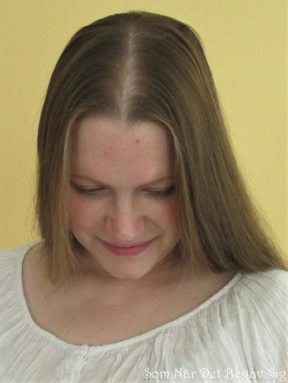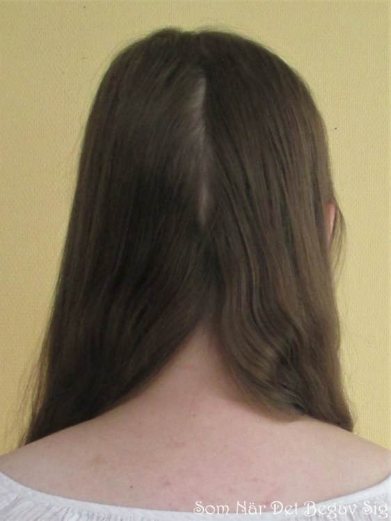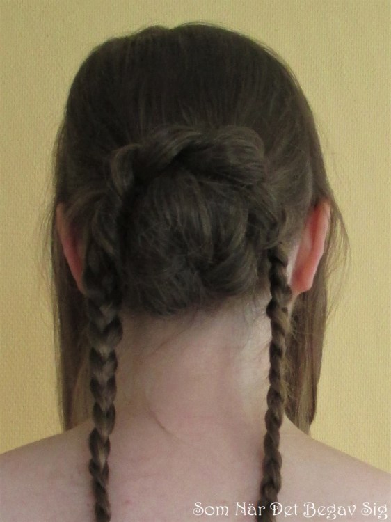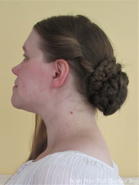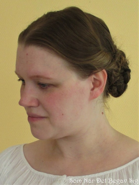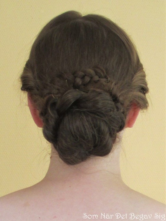 I min frisyr består bara de smalare dekorativa flätorna ovanför knuten av mitt eget hår, som inte är så tjockt men när bilderna togs nådde nedanför midjan. Har du lite för kort hår kan du hoppa över dem, eller använda lösflätor.Den här knuten är gjord av en hästsvans som ursprungligen satt fast på en klämma, den där sorten som går att köpa rätt billigt på många ställen. Jag hade tur som hittade en som matchar min egen hårfärg hyfsat. Klämman har tagits bort och löshåret har flätats. Flätan har sedan fästs med hårnålar till en knut. En sådan är bra att ha bland sina historiska (eller för all del moderna) hårprylar, då den lätt går att inkorporera i olika sorters frisyrer. Har du råd med det så kan du givetvis använda dig av löshår av högre kvalitet, som närmare matchar din egen hårfärg och inte glänser alltför plastigt. Hårnålarna som kommer att användas är av den här typen, de är bättre till detta och närmare sina historiska motsvarigheter än vad ”bobby pins” är.Det underlättar om du inte tvättat håret på några dagar, eller om du arbetat in lite tidsenlig pomada/modern gel innan du börjar, särskilt om du har halt, silkigt hår. Börja med att borsta ditt eget hår noggrant och mittbena det.Bena håret igen, från öra till öra, riktigt långt bak på hjässan, om du vill ännu längre bak än vad jag har gjort. Håll undan det främre håret tills vidare.Dela upp det bakre håret i två jämntjocka länkar. Den här benan ska kammas bort senare, så den behöver inte vara så exakt, men se till att håret är slätt och utan trassel.Gör två flätor precis bredvid varandra, långt ner i nacken. Dessa kommer du sedan att använda för att ge visuellt intresse till knuten. Om du tycker att det är enklare så kan du göra en hästsvans långt ner i nacken som du sedan gör två flätor av, du hoppar då över steget ovan.Kamma bort benan i nacken och nåla fast den lösa hårknuten över flätorna, så långt ner i nacken som det går – det tidiga 1860-talets frisyrer satt lågt. Se till att de flätor du gjort sticker ut, en på var sida, i jämnhöjd med varandra. Ju längre hår du har desto längre ner kan du låta dem titta fram – har du tillräckligt långt hår kan de hänga rakt ner från under knuten.När knuten sitter stadigt tar du den ena flätan och låter den följa knuten upp på huvudet och ner på andra sidan. Lägg den platt mot huvudet så att den syns bra och nåla fast den. Peta in änden under knuten.Ta nästa fläta och gör likadant med den, men låt den löpa precis över den första, så att de gör större intryck, nästan som en dekorativ kam av ditt eget hår. Nåla fast, se till att ändarna på flätorna inte kikar ut någonstans.Nu är det dags för det främre håret. Till skillnad från 1840-50-talen så var det nu vanligare att öronen var helt exponerade, framför allt hos yngre kvinnor, även om frisyrerna i grunden var konstruerade på i princip samma sätt som tidigare. Ta håret på ena sidan och dra det bakåt. Se till att det är slätt och tvinna det bakåt/uppåt, samtidigt som du drar det lätt bakåt.För hårtesten under knuten och vira den runt denna. Peta in den ordentligt under knuten så att den inte syns, du kan behöva lossa några hårnålar för att lyckas, och sedan fästa dem på nytt.Upprepa på andra sidan och se till att hårtestarna inte kan slinka ut. Släta vid behov till håret med en kam, glöm inte att kontrollera att det är slätt och fint även bak.Frisyren ser rätt enkel ut framifrån, men elegant bakifrån.