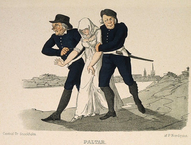 Separationsvakterna, nicknamed ”Paltar” (after a kind of blood pudding) as in this picture by Pehr Nordqvist, worked with female prisoners, often prostitutes. This woman could be one of those. Her dress and shoes are typical of the years around 1800.