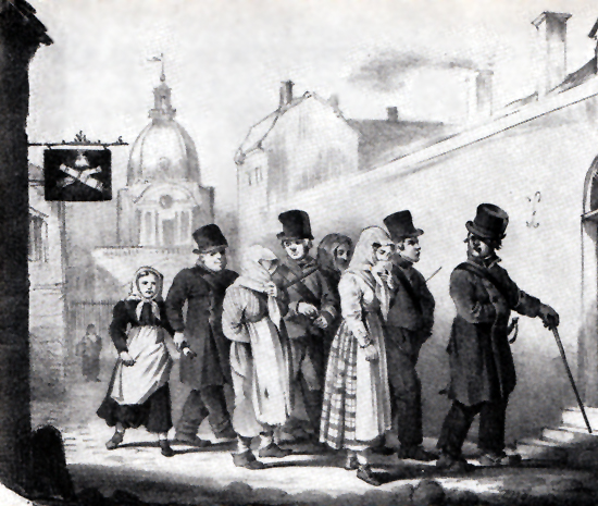 The women in “På väg till korrektionsinrättningen för kvinnor på Barnhusgatan i Stockholm” (“On the way to the workhouse for women on Foundling Home Street in Stockholm”) by Hjalmar Mörner, 1830, are wearing clothes that give echo of the current fashion, with full sleeveheads, waists approaching their natural place, heel-less boots, but with the aprons and headkerchiefs of common women. Nothing out of the ordinary.