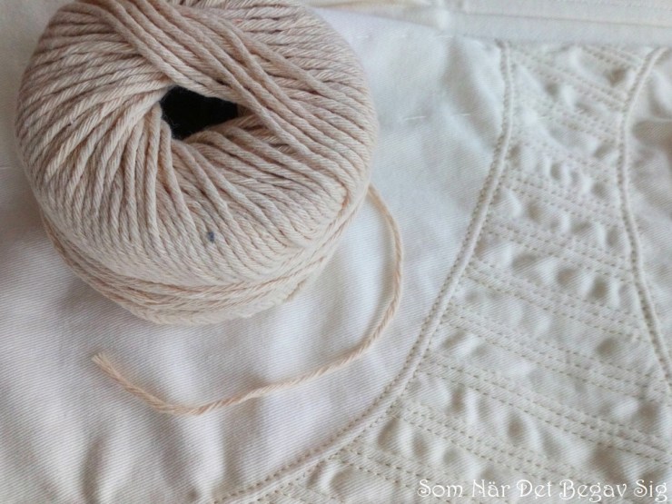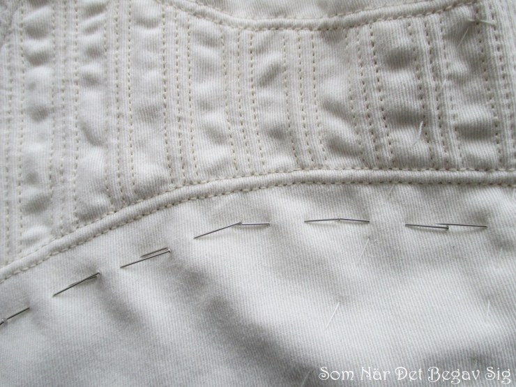 Stays (an earlier name for corsets) during the first half of the 19th century where relatively soft, sometimes boned with a few strips of baleen, and usually had a busk from solid wood or metal down the front. The rest of their stability they got from a technique called cording – cotton cords stitched between layers of fabric, creating a decorative relief pattern, and providing support. The cords can be inserted in a few different ways, and to my knowledge, no one has made a study of which method was the most commonly used. The cords can either be threaded between two finished seams, or they can be put next to a seam, after which the other seam is stitched to enclose it. I’ll be showing the second method here.