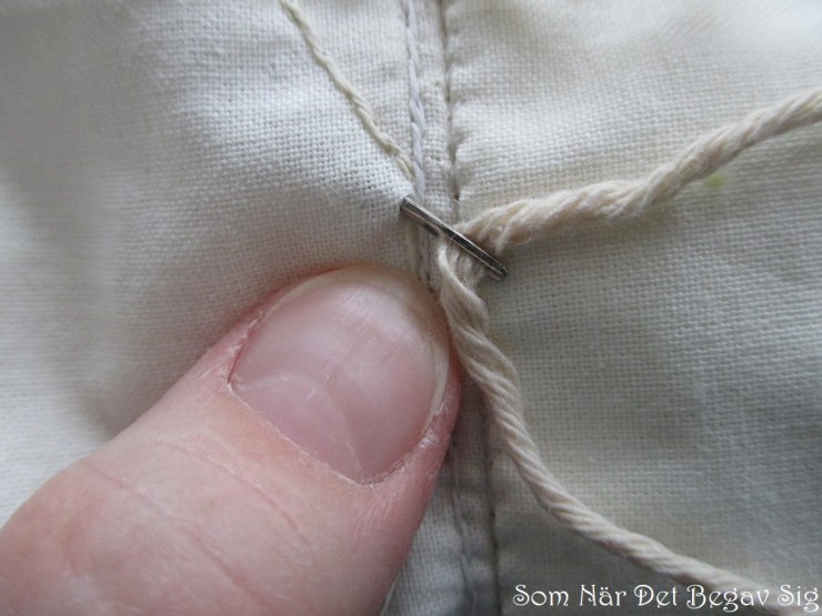 Knuffa upp snöret så att det ligger tätt intill sömmen som du precis sytt, naglarna kommer till bra hjälp här. Nåla eller tråckla vid behov.