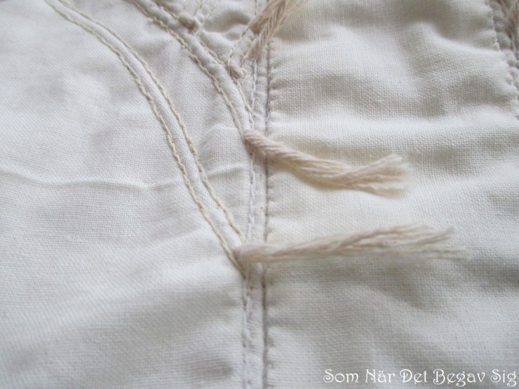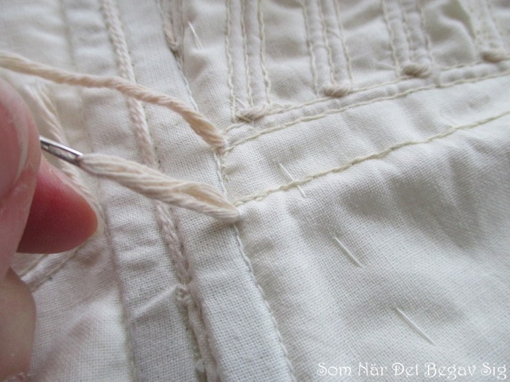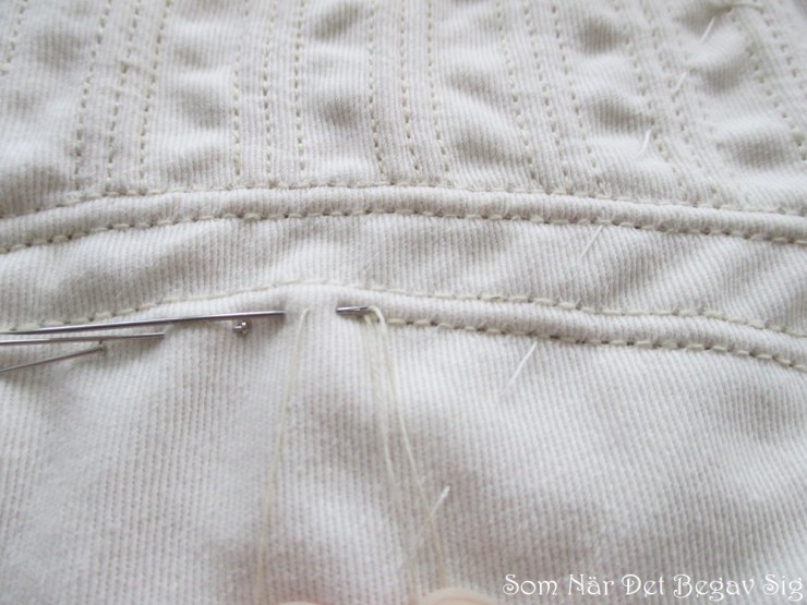 Arbeta nål och snöre mellan de båda tyglagren tills du är framme vid andra änden. Stick igenom fodertyget igen och dra ut snöret.