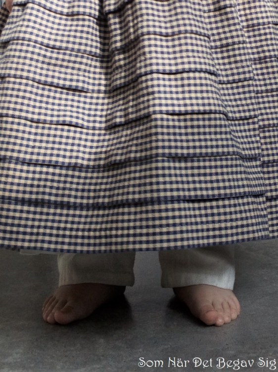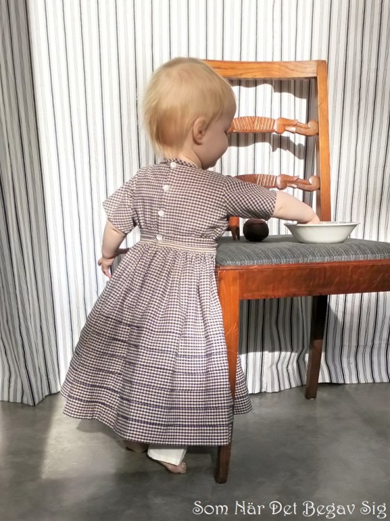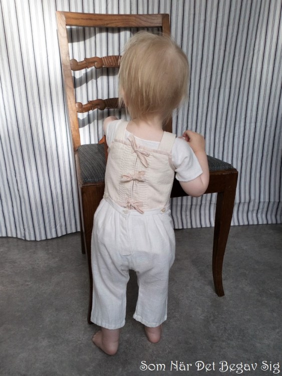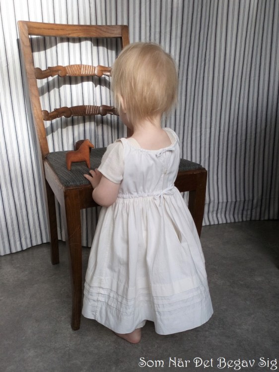 This is what it might have looked like when a lower middleclass toddler was dressed in the 1840’s. Wealthier children were dressed the same, but in fancier fabrics, poor children were dressed in simpler fabrics – perhaps they couldn’t afford all the layers either. Swedish country children also wore dresses, but a lot less influenced by fashion, so that is a subject for another post.